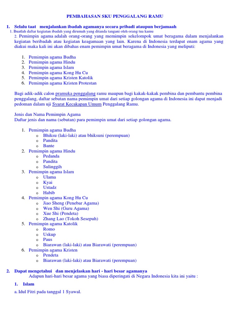 Materi dan jawaban sku penggalang ramu pramuka indonesia arti lambang gerakan pramuka blog rizky arief dasa dharma dan trysatya. Salam pramuka!<br>uji sku penggalang adalah sebuah aplikasi yang menghadirkan soal dan jawaban untuk ujian syarat kecakapan umum (sku) penggalang ramu rakit dan terap. Buku tuntas sku penggalang ramu ini berdasarkan syarat kecakapan umum terbaru (sku tahun 2011) sebagaimana sk kwartir nasional nomor 198 tahun 2011 tentang syarat kecakapan umum. Uji sku penggalang adalah sebuah aplikasi yang menghadirkan soal dan jawaban untuk ujian syarat kecakapan umum (sku) penggalang ramu rakit dan terap. Jawaban:kerukunan umat bragama yaitu hubungan sesama umat beragama yang dilandasi dengan toleransi, saling pengertian, saling menghormati, saling menghargai dalam kesetaraan pengamalan ajaran agamanya dan kerja sama. Materi sku penggalang ramu beserta jawabannya modus operandi. Jawaban sku pramuka penggalang ramu no. Materi kali ini masih seputar pembahasan sku penggalang ramu, yang mana materi kali ini adalah kelanjutan dari materi sebelumnya. Scout radio 1077 fm radio sahabat pramuka. Uji sku penggalang adalah sebuah aplikasi yang menghadirkan soal dan jawaban untuk ujian syarat kecakapan umum (sku) penggalang ramu rakit dan terap. Selalu taat menjalankan ibadah agamanya secara pribadi ataupun berjamaah. Selalu menjalankan ibadah agamanya secara pribadi ataupun berjamaah. Buatlah daftar kegiatan ibadah yang dirumah yang ditanda tangani oleh orang tua kamu.